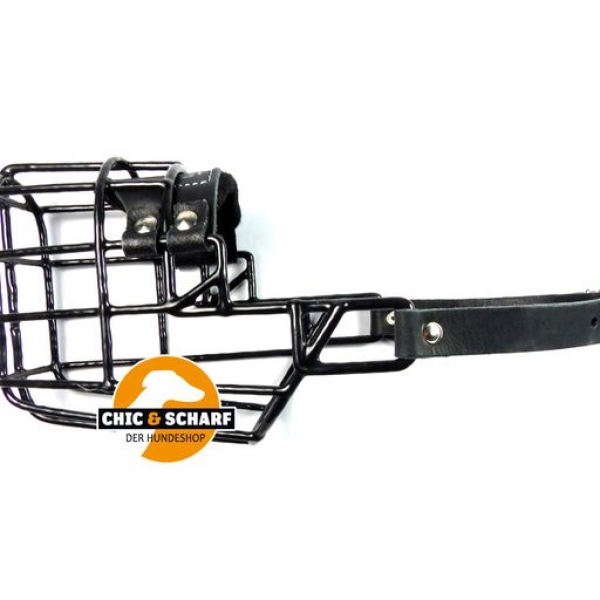 Chopo Drahtmaulkorb mit schwarzer Kunststoffgummierung, schwarzen Lederriemen und Filz unterlegtem Nasenpolster