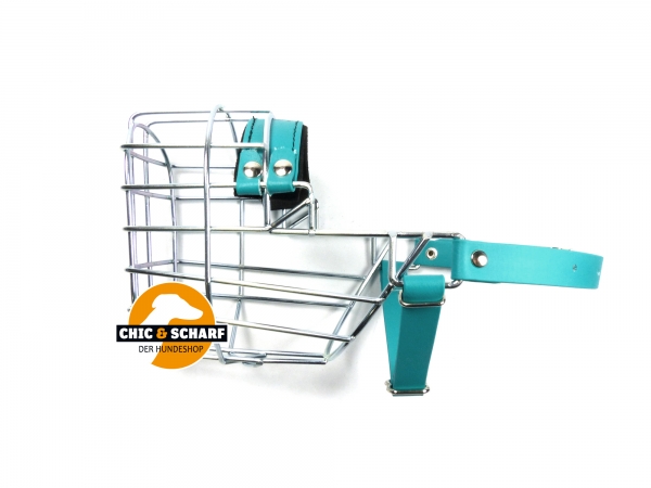 Verzinkter Chopo Drahtmaulkorb mit grünen Biothaneriemen, neoprenunterlegtem Nasenpolster und zusätzlichem Kehlriemen