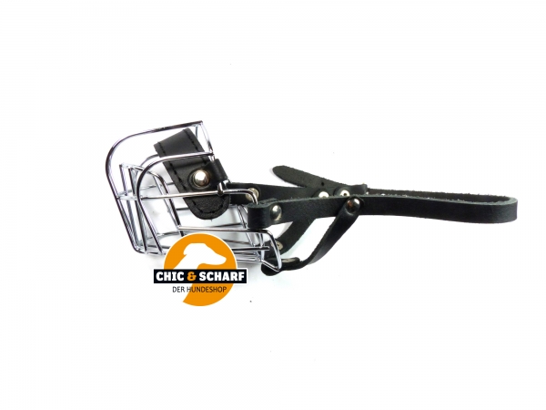 Verchromter Drahtmaulkorb aus gebogenem und verlötetem Draht. Schmal geschnittener Drahtmaulkorb ohne Stirnriemen mit filzunterlegtem Nasenpolster und schwarzen Lederriemen.