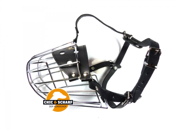 Verchromter Drahtmaulkorb aus gebogenem und verlötetem Draht. Breit geschnittener Drahtmaulkorb mit Stirnriemen mit filzunterlegtem Nasenpolster, schwarzen Lederriemen und verstellbaren Seitenriemen.